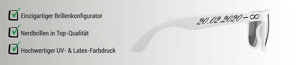 Die beliebteste Form der Personalisierung in diesem Zusammenhang ist die Beschriftung des Bügels. Hier entscheiden sich die meisten für den beidseitigen Bügeldruck, wobei die Namen des Brautpaares auf die eine Seite und das Datum auf die andere Seite gedruckt werden. Dazu stehen zahlreiche Schriftarten und Formatierungsmöglichkeiten zur Verfügung. Der Konfigurator für Sonnenbrillen zeigt direkt auf, wie sich die Schrift auf der Sonnenbrille macht. Bei der Farbe des Brillengestells entscheiden sich die meisten für Schwarz. Die Form des Gastgeschenkes wird auch als Nerdbrille bezeichnet. Dieses Modell erfreut sich seit den 80ern großer Beliebtheit und erlebt aktuell ein großes Revival.